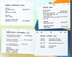 Un amigo me dio el excelente consejo de tomar una carpeta de 3 anillos (mi “cuaderno”) y agregarle toda la información y los informes que recibo de mi hermana al pasar el tiempo. Entonces, comencé una carpeta sobre ella. Funcionó tan bien que ahora tengo una sección para cada miembro de mi familia. Cuando surge una pregunta o llega una cita con el médico, ¡toda nuestra información médica importante está en un solo lugar! Ahora, esta parte de mi vida es mucho más simple.