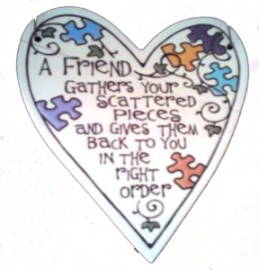 I have a plaque that says, “A Friend gathers your scattered pieces and gives them back to you in the right order.” God is that Friend.