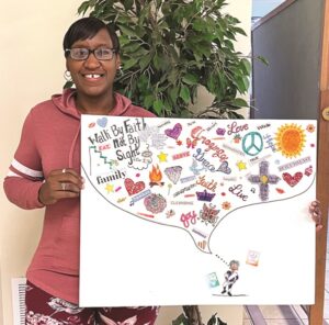 Las pequeñas figuras de palitos representan a mi familia reunida: yo, mi mamá, mi hermana, mis hijos y mis nietos. Estuve separada de ellos durante diez años, y ahora llevamos juntos el mismo tiempo. ¡Dios nos ofrece belleza en lugar de cenizas (Isaías 61:3)!