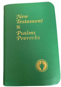 My boyfriend and I slept on beaches and ate crackers from a salad bar. We were invited to eat Thanksgiving dinner in the mess hall of a naval base near where we slept. As I was going into the mess hall, I saw a rack full of literature and a small green hand-sized Bible. I picked it up and put it in my pocket. I read it from time to time and I really liked it.
